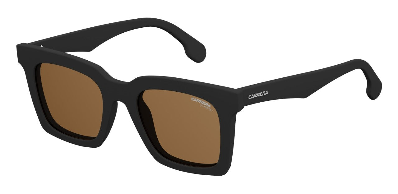 A cat eye shape with plastic injected front and temples and polycarbonate lenses. The main aesthetics elements are: the C logo on the left end tip and Carrera logo in high relief on the temples. The lenses are available in 4 colors: brown, Red HD Polarized, grey and gold. The frames are available in: shiny black, matte black, dark blue and dark green.