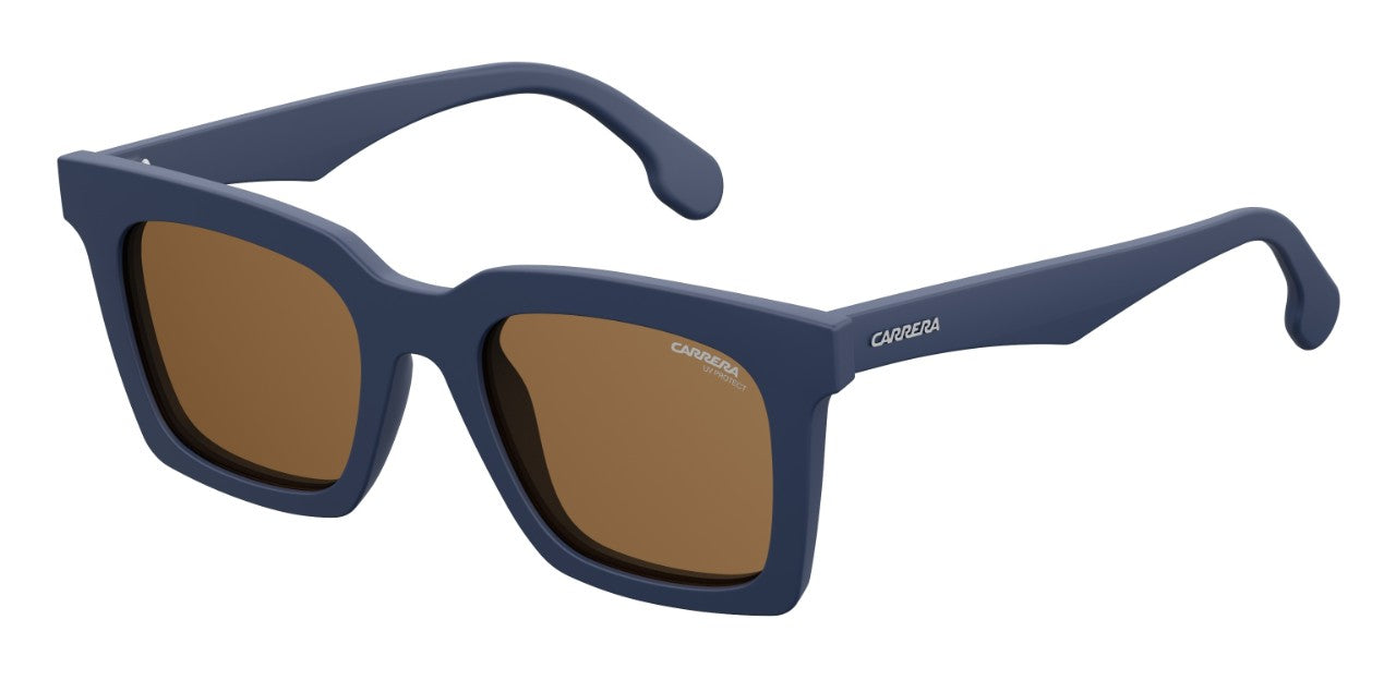 A cat eye shape with plastic injected front and temples and polycarbonate lenses. The main aesthetics elements are: the C logo on the left end tip and Carrera logo in high relief on the temples. The lenses are available in 4 colors: brown, Red HD Polarized, grey and gold. The frames are available in: shiny black, matte black, dark blue and dark green.