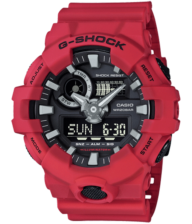 From G-SHOCK, the watch brand that constantly sets new standards for toughness, comes the GA700 analog-digital watch with bold new case silhouette featuring 3D dial and hands for a multi-dimensional, carved out of metal look. This new design not only improves reading, but projects added toughness with front button super illuminator LED light adding to its overall dynamic styling. Three colorways in black & red reflect the G-SHOCK brand concept and capture the ethos of Absolute Toughness which these models are designed to represent.