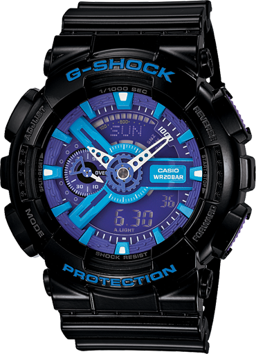 X-Large G goes warp speed with the new GA110HC-1A, decorated in sleek, gloss black and hyper blue. Adding strength beneath the decoration is an anti-magnetic, shock & water resistant structure. World time, Auto LED light and a 1/1000th second stopwatch with speed indicator highlight its functionality.