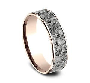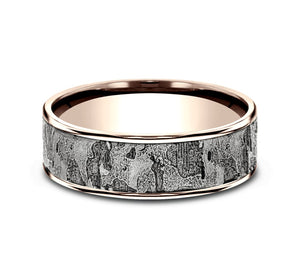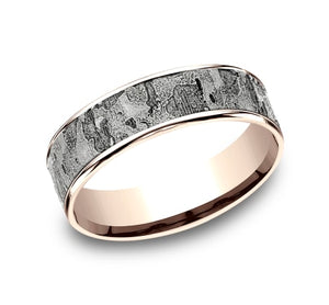 This incredible 6.5mm two-toned band with an intricate wall fracture center is framed beautifully by two high-polish thin edges.