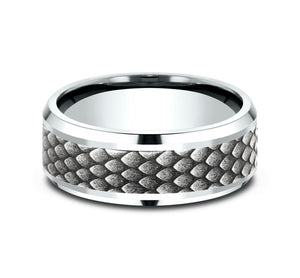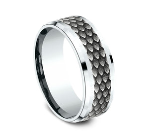 The wear resistant black detailing on this 8mm two-tone ring creates a fierce dragon scale design.
