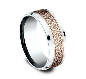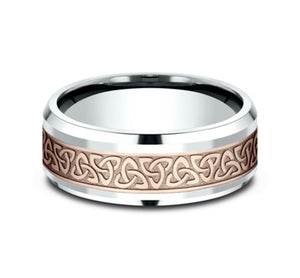 This multi-gold design band features the iconic Celtic Knot amidst high polish drop bevel edges.