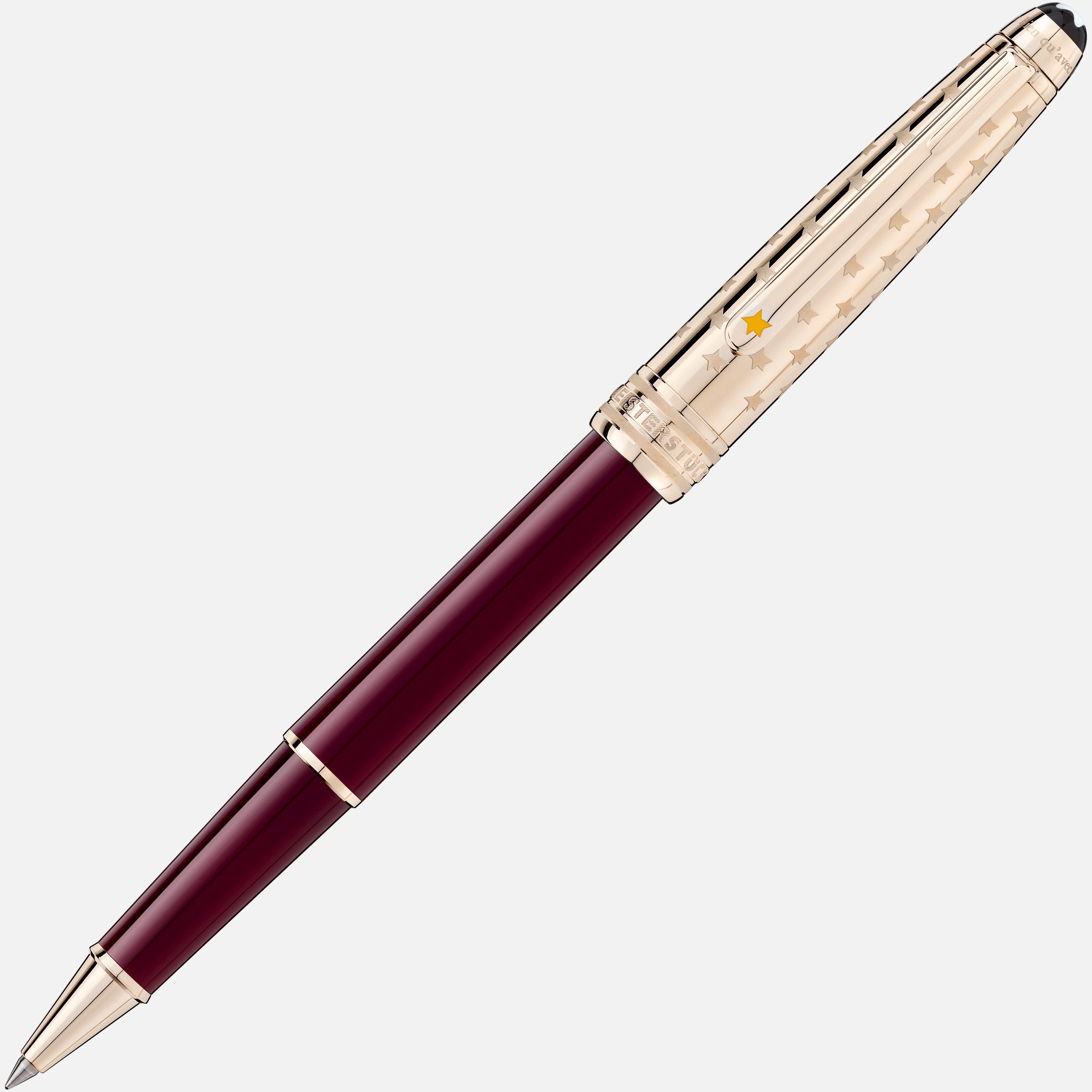 The Meisterstück Le Petit Prince Doué Classique Rollerball Pen with burgundy lacquer is linked to the planet: synonym of care, love, laughter and a meaningful life. The central ring of the three platinum-coated rings features the Montblanc brand name and the clip is embellished with a yellow lacquered star.