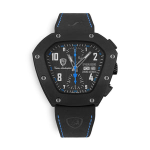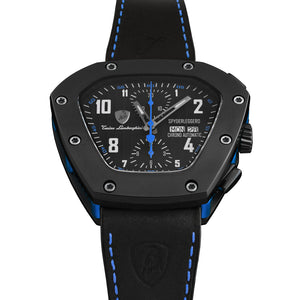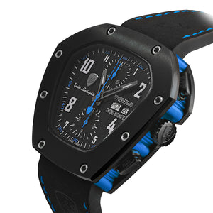 Dial: black in côte de Geneve. Luminescent decalque indexes, coloured finishing and seconds hand. Tonino Lamborghini shield at 9H, day and date at 3H.